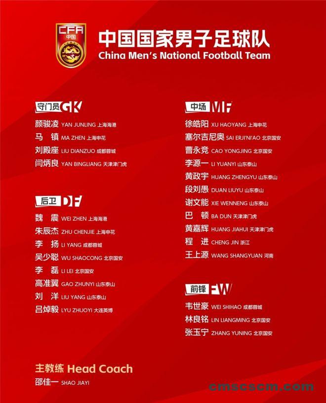 附:中国男足最新26人名单