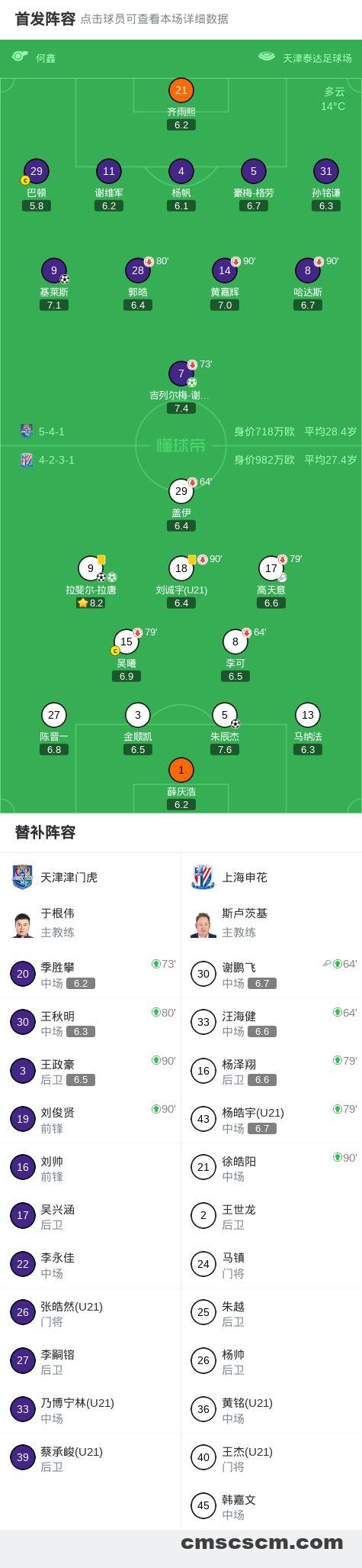 北京时间4月5日中国足球超级联赛 联赛 第4轮,天津津门虎主场对阵上海申花。天津津门虎吉列尔梅-谢蒂内破门,基莱斯破门。上海申花朱辰杰破门,拉斐尔-拉唐梅开二度。最终比分天津津门虎 23 上海申花。