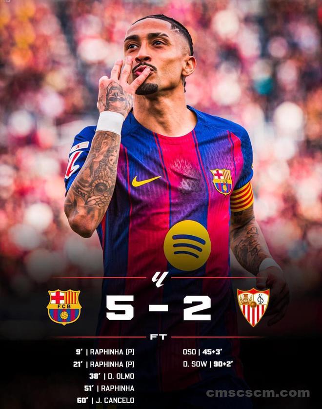 仅仅9分钟之后,坎塞洛再次成为焦点。他从左路带球长驱直入,在禁区前连续变向晃开角度,随后冷静推射远角再下一城,巴萨将比分扩大到5-1,比赛基本失去悬念。第92分钟,塞维利亚的奥索左路送出精准传中,索乌抢点头球破门,将比分改写为2-5。最终巴萨5-2完成了一场彻底的复仇,同时也喜提球队西甲4连胜,在争冠最关键阶段,他们依旧领先皇马4分,压力再次扔回给了银河战舰。