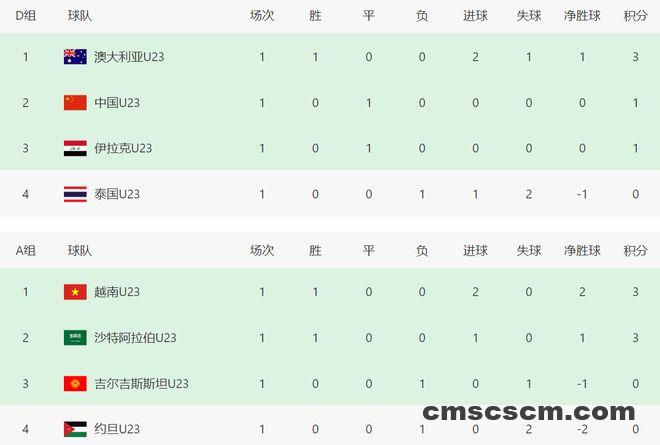 北京时间1月8日晚上,2026年U23亚洲杯正赛首轮继续进行,D组两场比赛,中国男足0-0打平伊拉克男足、澳大利亚男足2-1逆转泰国男足。最新积分榜,澳大利亚队排名第一,中国队和伊拉克队并列第二,泰国队沦为垫底。