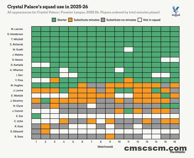 本赛季,水晶宫就是如此。尽管多线作战,格拉斯纳仍倾向于保持一套稳定的阵容——以至于他们因参加欧协联,对阵阿森纳的联赛杯四分之一决赛不得不推迟到下周。