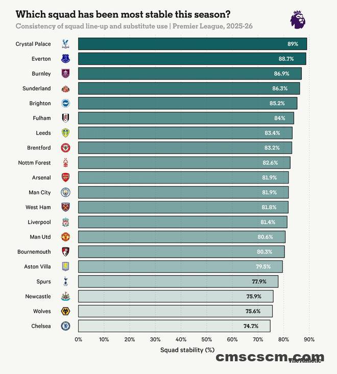 近日,The Athletic发表了专题文章,深度分析了英超球队在密集赛程下的阵容管理策略,通过独创的“阵容稳定性评分”量化各队的轮换程度,并聚焦水晶宫与切尔西这两个截然相反的案例,揭示了阵容稳定与否与球队成绩之间复杂而微妙的关系。