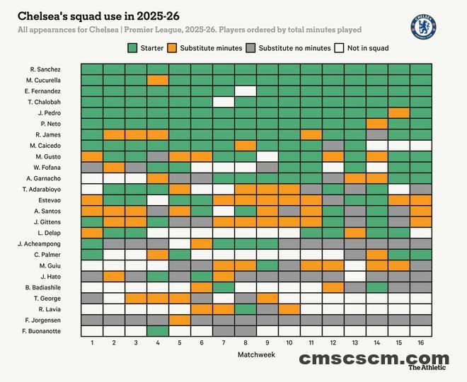 阵容出场时间变动最大的是切尔西,马雷斯卡的轮换政策是一种精心策划的尝试,旨在为可能多达67场比赛的赛季管理他的球队。
