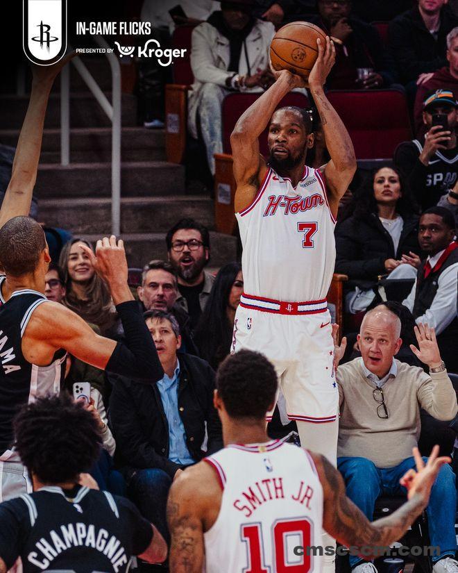马刺队的文班亚马得到28分、16个篮板和4次助攻,福克斯得到18分、5个篮板和8次助攻,约翰逊得到17分、7个篮板和5次助攻,卡斯尔得到16分、5个篮板和6次助攻,哈珀得到16分。火箭队的汤普森得到25分和7个篮板,杜兰特得到24分和6次助攻,他生涯命中三分球数超越卡特升至历史第10位。申京得到18分、10个篮板和7次助攻,伊森得到10分,谢泼德得到9分和5个篮板。
