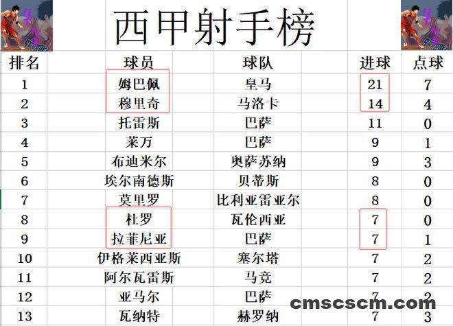 射手榜方面,姆巴佩梅开二度后,成为赛季第1个进球上20的球员,领先第2名的穆里奇7球稳居榜首。托雷斯11球第3,布迪米尔追上莱万,两人9球并列第4。杜罗追上拉菲尼亚,亚马尔等人7球刚好挤入前十。