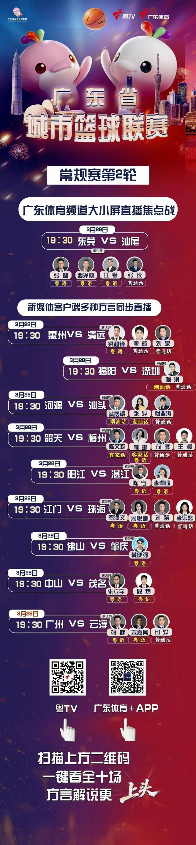 粤BA第二轮本周末就将上演十场大战。广东体育频道和粤TV将为大家送来全部比赛的同步直播,并有普通话、粤语、潮汕话、客家话等多路解说任君选择。