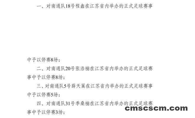 江苏足协发布的公告同样对多名球员进行了严厉处罚,比起上海足协只针对邝继鸿的禁赛,南通队共有4名球员被禁赛,其中程鑫、张浩楠在江苏省内停赛8场,薛天翼停赛5场,季桑楠停赛3场。这样的处罚力度还是非常大的,这些球员大多都是南通队参加本赛季苏超的主力球员,他们被停赛对球队的实力造成了一定的影响,尤其是8场比赛的禁赛,苏超整个赛季如果不计算淘汰赛的话也不过只有12场比赛。