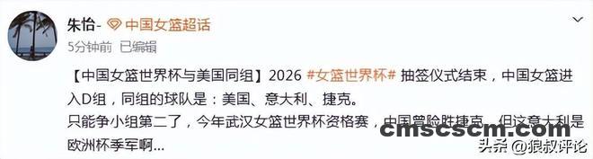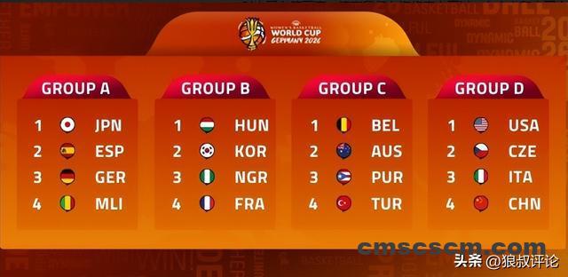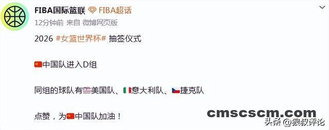 北京时间4月22日,2026女篮世界杯小组抽签仪式在德国柏林举行,中国女篮被分在D组,同组对手有美国女篮、捷克女篮和意大利女篮。
