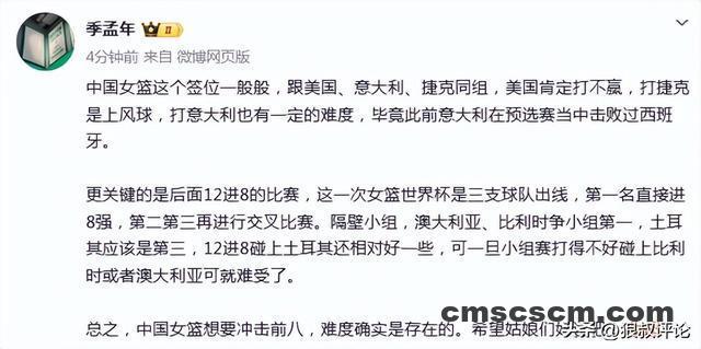 中国女篮这个签位一般般,跟美国、意大利、捷克同组,美国肯定打不赢,打捷克是上风球,打意大利也有一定的难度,毕竟此前意大利在预选赛当中击败过西班牙。